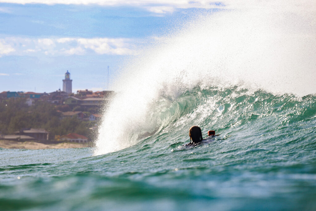 Na prática, esse momento exige leitura constante do mar. Corrente, vento, formação das séries, luz e posição do surfista precisam ser percebidos quase ao mesmo tempo. O fotógrafo não está apenas observando, está inserido no ambiente, lidando com a água em movimento, ajustando o corpo, a respiração e o enquadramento enquanto tudo acontece. Não existe pausa técnica fora do fluxo. Existe presença, adaptação e escuta.